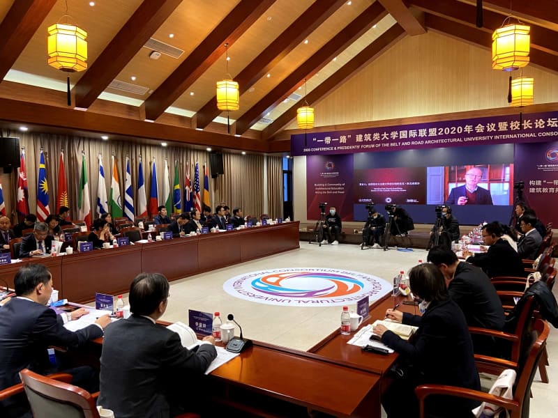 10月30日、北京建築大学で、オンラインを通じて海外の大学責任者による講演を視聴する教員。(北京=新…