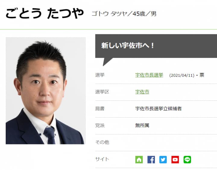 4月11日に告示された宇佐市長選には、新人の後藤竜也(ごとう・たつや)氏(45)、現職の是永修治(こ…