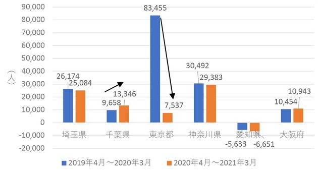 はじめに 〜コロナ禍の一年、東京一極集中から流出への人口動向の大転換を振り返る〜東京都の年間の転出入…