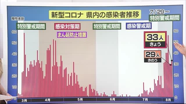 愛媛県内の詳しい感染状況です。 10日に発表された感染者数は33人と、休日中の検査にも関わらず、連日…