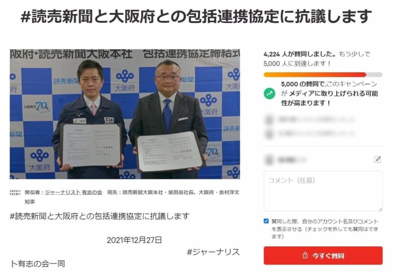 大阪府と読売新聞大阪本社が包括連携協定を結んだことを受け、ジャーナリストらでつくる有志の会が2021…
