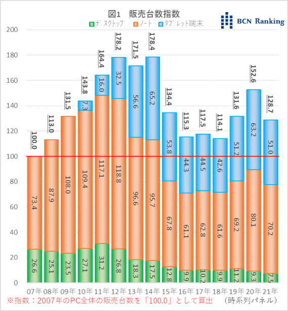 ノート、デスクトップ、タブレット端末を合わせたパソコン(以下、PC)市場を2007年から15年にわた…
