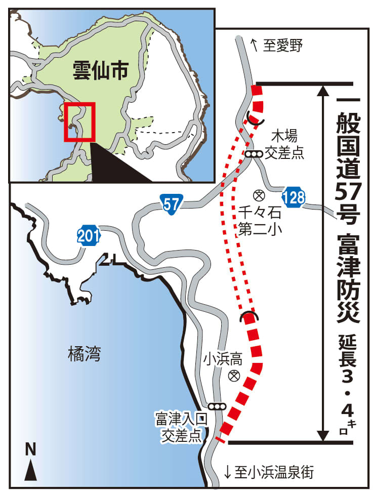 長崎県雲仙市小浜町富津地区の防災対策などとして、小浜町と同市千々石町を結ぶ国道57号の代替路「富津防…