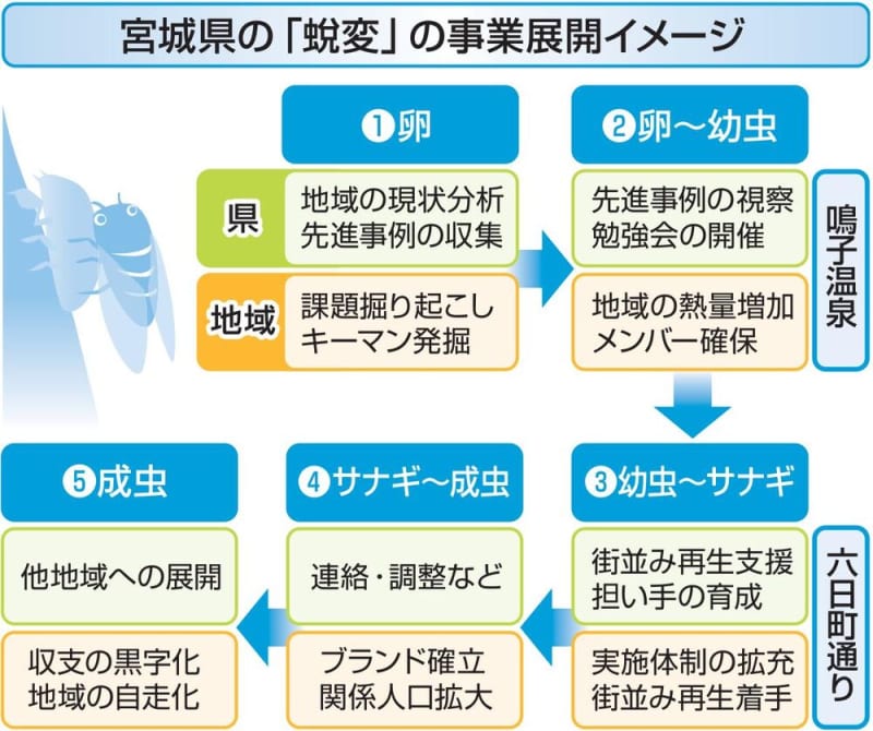 宮城県は、栗原市の六日町通り商店街のような地域再生モデルを「蛻変(ぜいへん)」と定義し、多くの地域に…