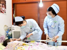 済南市天橋区で、訪問先の患者に栄養を与える山東省立第三医院の看護師。(2月23日撮影、済南=新華社記... (さらに…)…