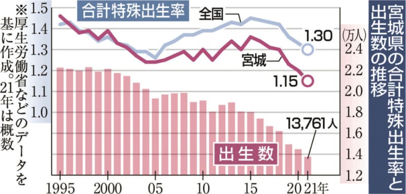 宮城県の少子化が加速している。2021年の出生数は厚生労働省の人口動態統計(概数)で1万3761人と…