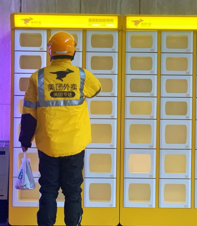 北京市で出前用宅配ボックスに食事を届ける美団の配達員。(2020年1月31日撮影、北京=新華社配信)…