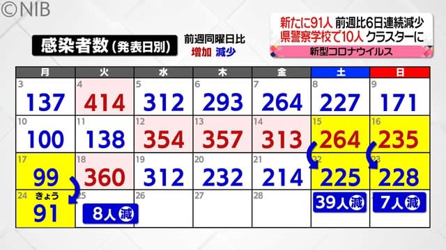 新型コロナウイルスは24日、新たに91人の感染が確認されました。前の週との比較では6日連続で減少して…