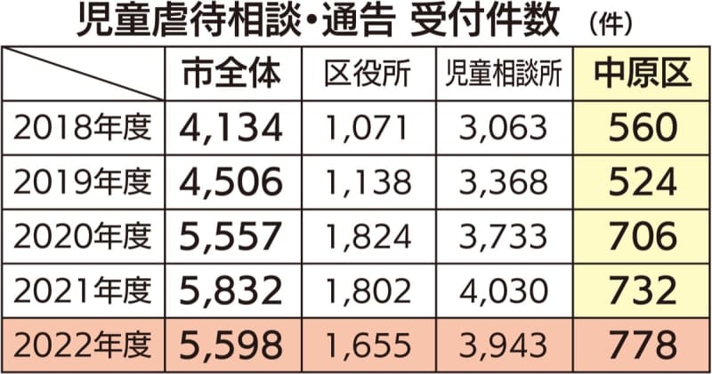 川崎市は2022年度の市内児童虐待相談・通告件数が対前年度比4・0%減の5598件だったと先月末に発…