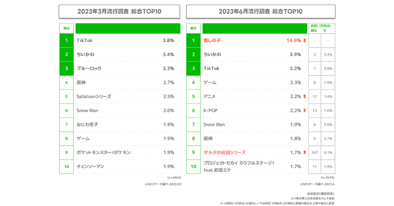 LINEリサーチは、全国の15~24歳の男女を対象にした「若年流行調査」の2023年上半期(3月、6…