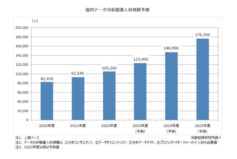 データ分析関連人材規模に関する調査を実施(2023年)~2023年度の国内データ分析関連人材規模を123,400人と予測、2025年度には176,300人に達する見通し、データドリブン経営の浸透に向けて、ジョブ型採用への移行や研修プログラムの急ピッチな整備が続き、データ分析人材の育成が進む~
