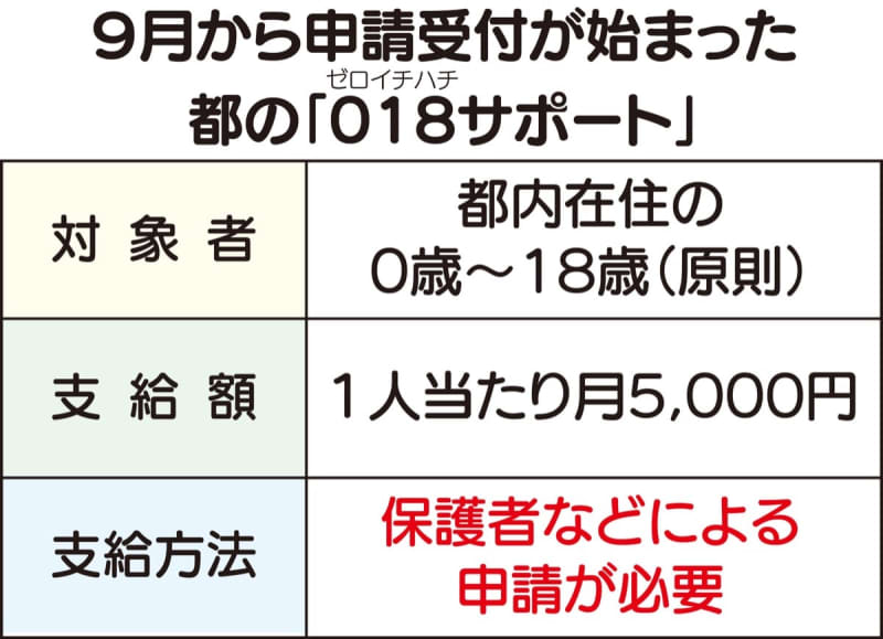東京都は子育て支援策として、都内に住む18歳以下の子どもに対し、1人当たり月額5000円を支給する「…