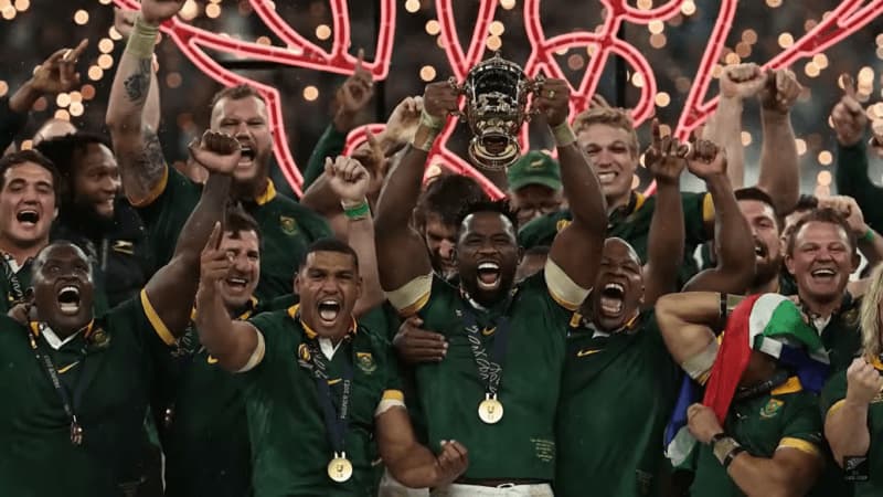 2023年ワールドカップを掲げるラグビー南アフリカ代表チーム、スプリングボクス。Black Jers…