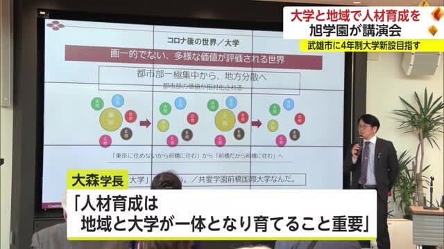 武雄市で新しい大学の設置を進めている旭学園が市内で講演会を開き、大学と地域が一体となって人材を育成す…
