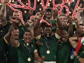 2023年ワールドカップを掲げるラグビー南アフリカ代表チーム、スプリングボクス。Black Jers... (さらに…)…