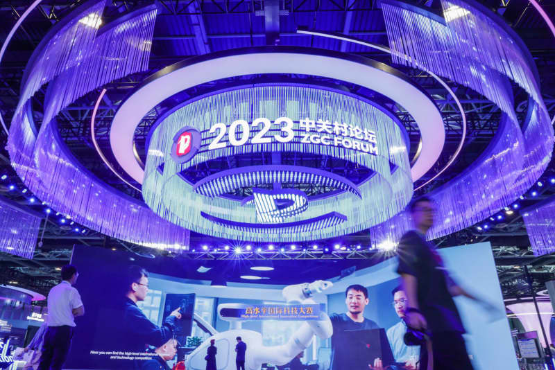 中関村国家自主イノベーションモデルエリア展示センター。(2023年5月26日撮影、北京=新華社記者/…