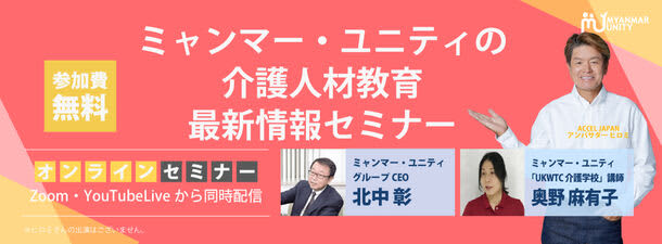 - <介護教育のノウハウを一挙公開> ミャンマー・ユニティの介護人材教育最新情報セミナー<7/3 14時無料生配信> ~ほとばしる情熱を降り注いだ外国人介護人材育成のAtoZがここに~