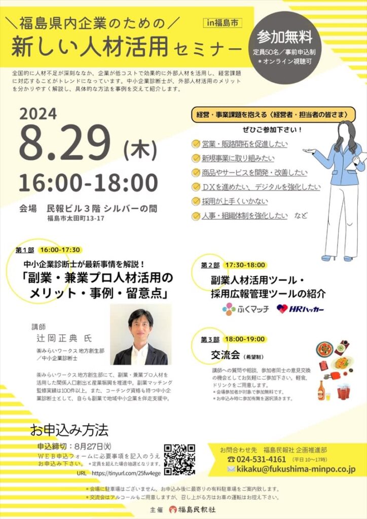 福島民報社は、企業や団体の課題解決を後押しする「新しい人材活用セミナー」を29日午後4時から、福島市…