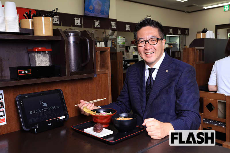「資さんうどん」名物の「資さんしあわせセット」を食べる佐藤崇史社長(写真・繁昌良司) (《東京進出!…