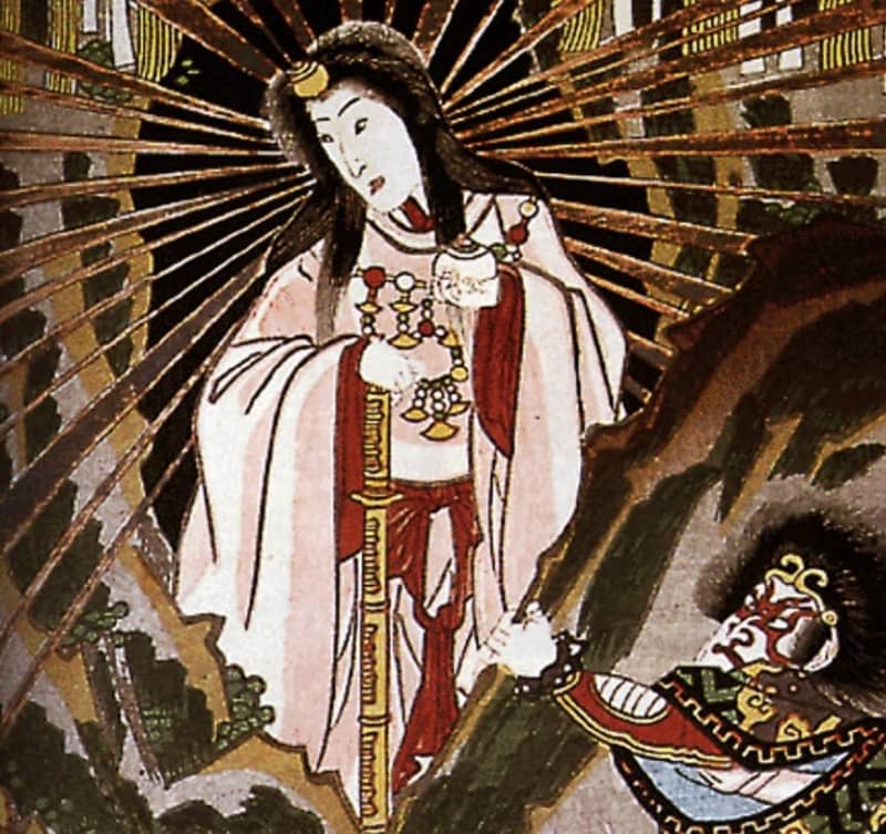 天皇家の皇祖神とされる天照大神天照大神『岩戸神楽ノ起顕』(部分)1857年(安政4年)歌川国貞 画 …