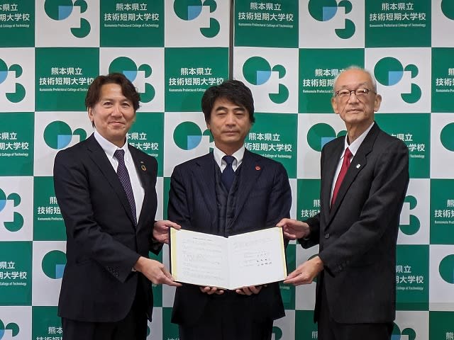 連携協定に署名した(左から)日総工産の藤野専務、熊本県の上田商工労働部長、県立技術短期大学校の尾原校…