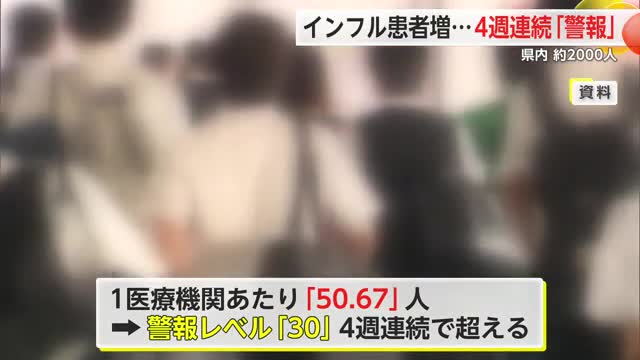 県内のインフルエンザの患者数は約2000人と、前の週より300人あまり増えました。県は、4週連続で「…