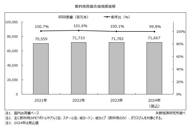 飲料用容器市場に関する調査を実施(2024年)~2024年の飲料用容器の国内市場規模は前年比99.8%の716億6,700万本の見込み、成熟は必ずしも停滞ではない、未知の領域への確実な布石で成熟の先にある成長をつかめ~