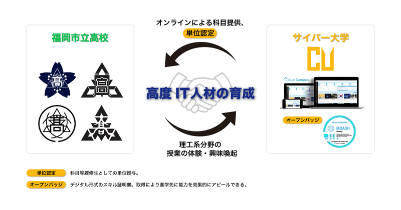 サイバー大学は、福岡市立福翔高等学校、博多工業高等学校、福岡女子高等学校、福岡西陵高等学校の4校と高…