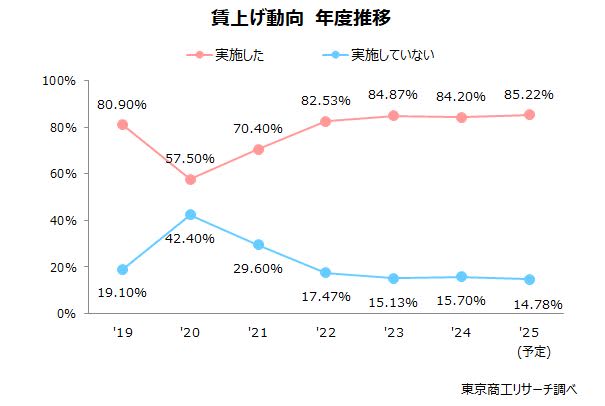 2025年2月「賃上げ」に関するアンケート調査2025年度に賃上げを予定する企業は85.2%だった。…