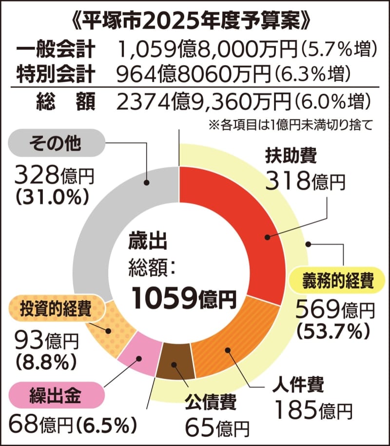 平塚市は2月13日、2025年度当初予算案を発表した。一般会計は前年度比5・7%増の1059億8千万…
